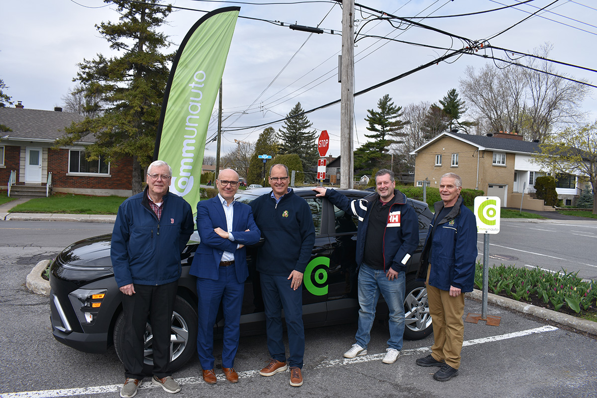 Légende photo, de gauche à droite : Paul Trudeau, conseiller municipal,Marco Viviani, vice-président développement stratégique chez Communauto, Marc Doret, maire de la Cité de Dorval, Jean-François Leroux et Robert Le Sage, tous deux conseillers municipaux.