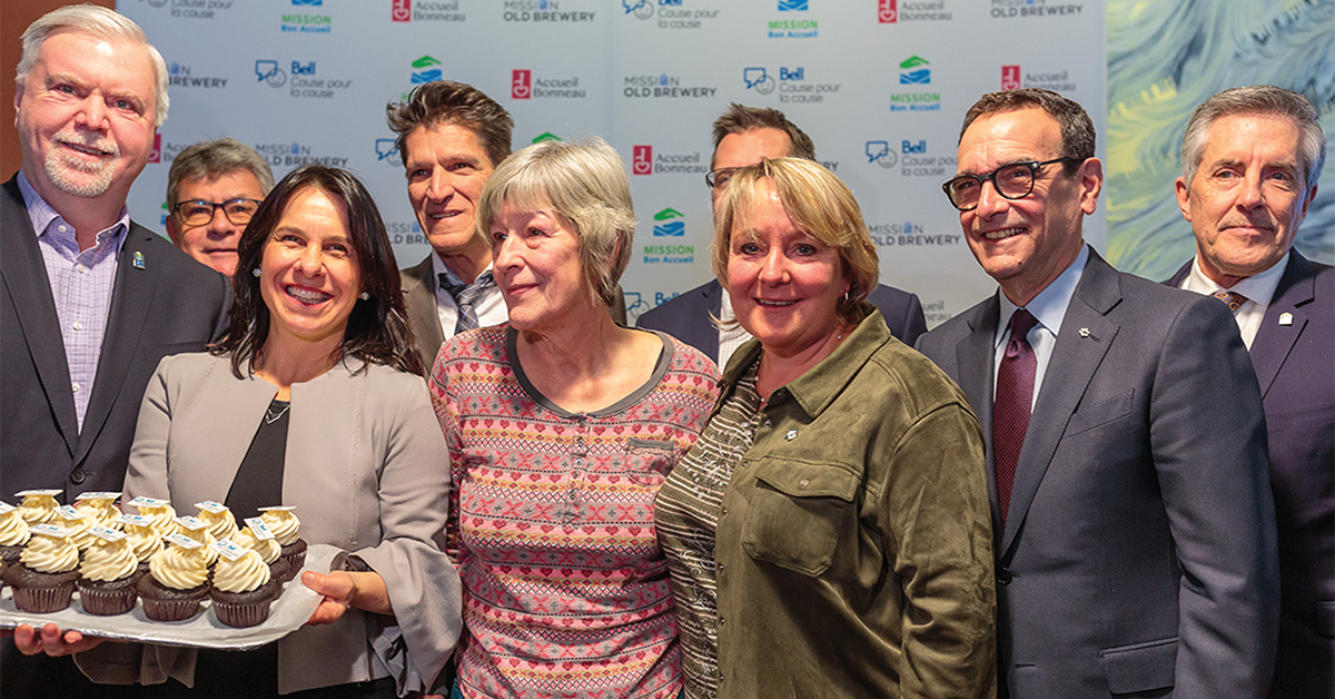 Feature image: From left to right, front row: Sam Watts, CEO and Executive Director of Welcome Hall Mission, Montreal Mayor Valerie Plante, Martine Turcotte, Bell’s Vice Chair Quebec, Eric Maldoff, Chair, Board of Directors of the Old Brewery Mission, Matthew Pearce, President and CEO of the Old Brewery Mission. From left to right, back row: Cyril Morgan, Chair, Board of Directors of Welcome Hall Mission, Aubin Boudreau, Executive Director of Accueil Bonneau and Dr. Olivier Farmer, Psychiatrist at Notre-Dame Hospital.