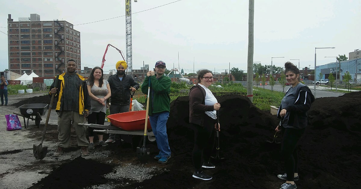 While Sun Youth had to say goodbye to one of its urban gardens when leaving its St-Urbain Street location, an opportunity presented itself with the move to the new 6700 Parc Avenue location with Universite de Montreal’s MIL Campus where many ephemeral projects have emerged in the last 5 years thanks to some 30 different partners. Such is the case of Sun Youth’s ephemeral urban garden which was inaugurated on June 13thwith the spreading of the soil on the ground by a group of volunteers.