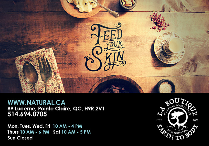We stand behind our products. We give great customer service. Visit us at natural.ca. Subscribe to our newsletter. Visit our store: ‘La Boutique Earth to Body’, 89 Lucerne, Pointe Claire, QC., H9R 2V1. Email