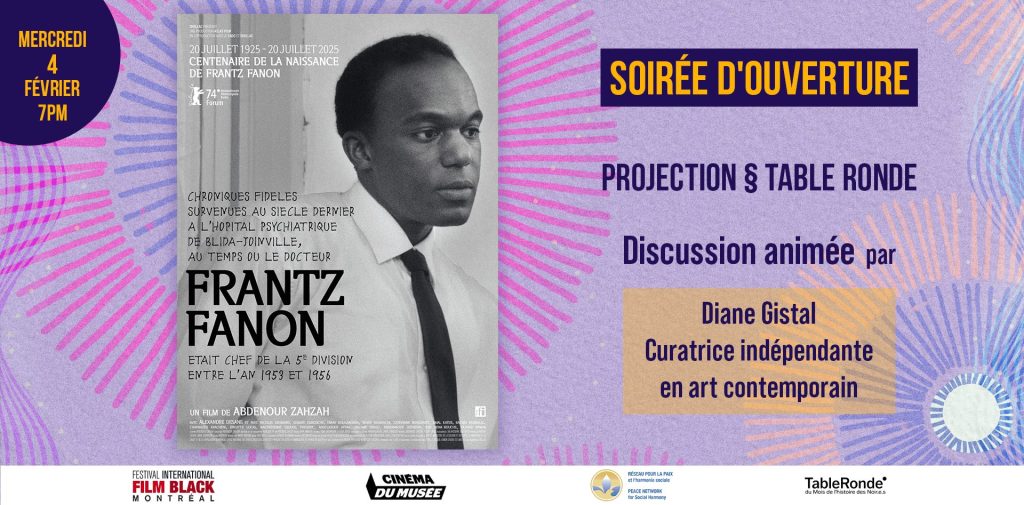 Presented in partnership with the Network for Peace and Social Harmony, the Montreal International Black Film Festival (MIBFF), Cinéma du Musée, and the Black History Month Round Table.The Fondu au Noir Festival will officially launch its 15th edition with an evening rooted in memory, reflection, and engagement. The powerful film FRANTZ FANON opens this anniversary edition with depth and relevance. Following the screening, a roundtable discussion moderated by Diane Gistal, independent contemporary art curator, will feature Thibault Tranchant, PhD in Philosophy and professor at Cégep Édouard-Montpetit, and Ernest-Marie Mbonda, professor of philosophy and specialist of Frantz Fanon’s work.