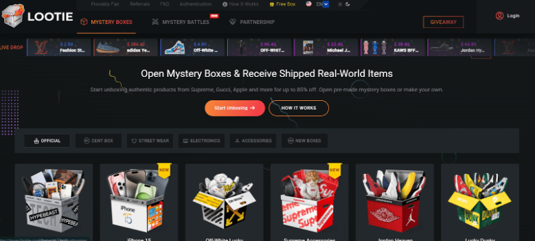 Lootie built its reputation on sneakers and streetwear, offering extensive collections of Jordans, Yeezys, and limited Nike releases, but it has also branched out into other popular categories. The platform shows exact odds for each box, and you can also verify that each unboxing was fair. Sneakerheads will find some of the latest releases, though browsing through everything takes patience due to the busy interface design.