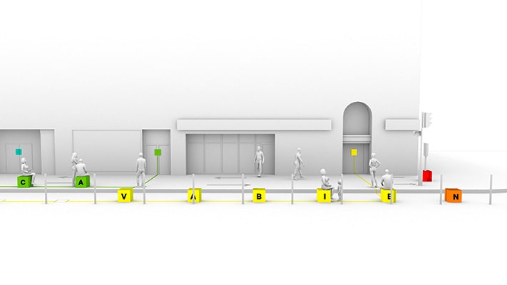 Widened pedestrian walkways on Saint Catherine West will offer extra space with three aisles: one aisle for people waiting in line, one aisle for pedestrian traffic in each direction and a rest area with colourful cubes depicting the symbolic rainbow, all separated by signage marking the pavement. The user-friendly street furniture was designed by DIX au carre, a Quebec design firm renowned for its public installations.