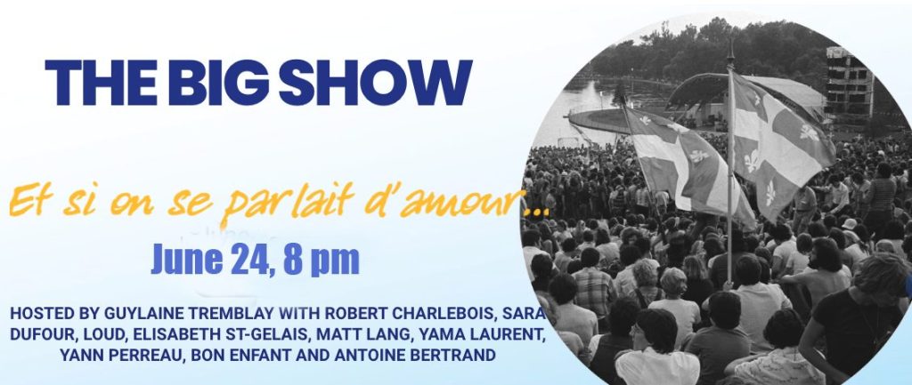 hosted by GUYLAINE TREMBLAY, the Big Show will feature on stage ROBERT CHARLEBOIS, SARA DUFOUR, LOUD, ELISABETH ST-GELAIS, MATT LANG, YAMA LAURENT, YANN PERREAU, BON ENFANT and ANTOINE BERTRAND, with the exceptional participation of the Grand Chœur de l’Alliance chorale du Québec with 150 choristers.