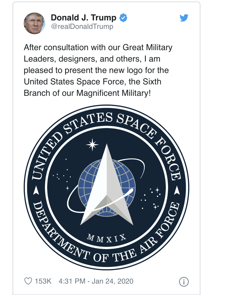 President Trump tweeted, “After consultation with our great military leaders, designers and others, I am pleased to present the new logo for the United States Space Force, the Sixth Branch of our magnificent military.”