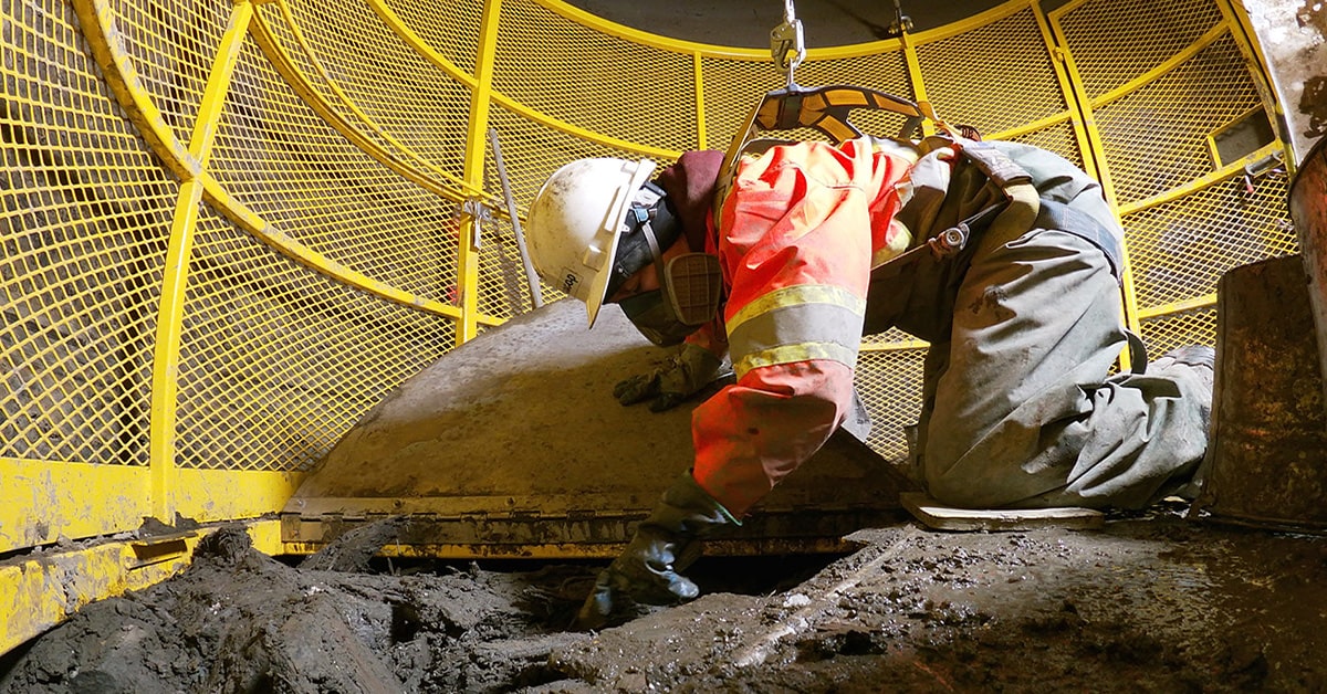 After the preparatory work, archaeological excavations were carried out at the site of the future pillar. It was a very meticulous undertaking – the excavations occurred within a diameter of three metres with little space to proceed, as the railway tracks were right next to it. First, the steel ‘caisson’ (drilled shafts, cast-in-place, deep foundation elements, designed with steel reinforcement) was bored and anchored in the rock, at a depth of about 12 metres. The railway embankment (about five metres) was excavated to reach the level of the cemetery. Archaeologists entered the caisson in a cylindrical basket, custom-designed for the project. The basket had six removable plates, allowing the archaeologists to methodically carry out the excavations.