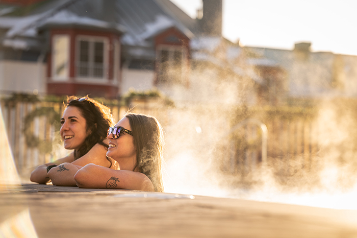 Guests staying on-site can enjoy Les Jardins de glace, a magical winter playground perfect for families and friends. The outdoor space includes a snow hill where children can slide freely, an illuminated skating rink with complimentary skate rentals for resort guests, and Bavarian curling for all to enjoy. After the fun, young and old can warm up by the outdoor firepit and soak in the festive village atmosphere.