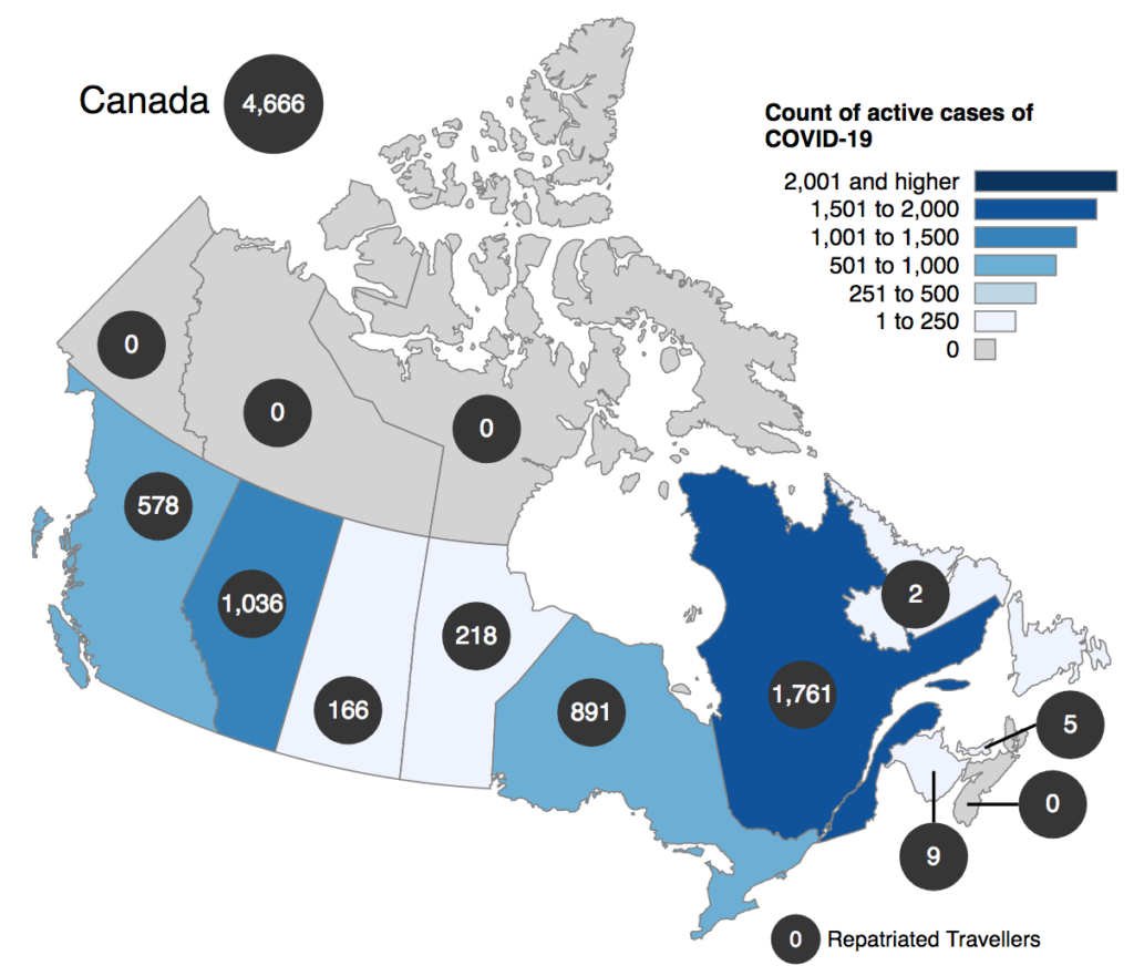 The United States has reported over 5.25 million cases and over 167,000 deaths due to COVID-19, while Canada has reported a total of 121,234 cases and 9,015 deaths. Canada has 4,665 active cases of COVID-19.