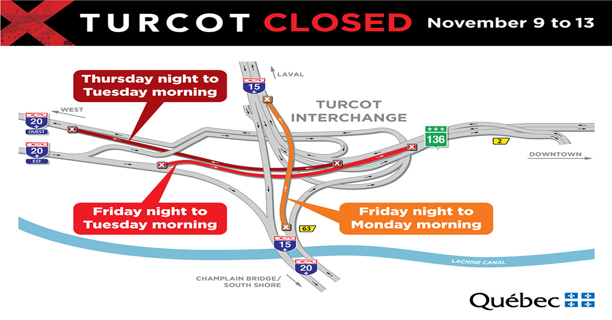 Highway 20 closed both directions – An exceptional closure will be in place in the Turcot interchange from November 9th to 13th. Very difficult traffic conditions are expected on the motorway network during this period. The collaboration of all, both road users and employers, is required. Road users must review how they move during these days, opt for public transit and avoid non-essential travel.